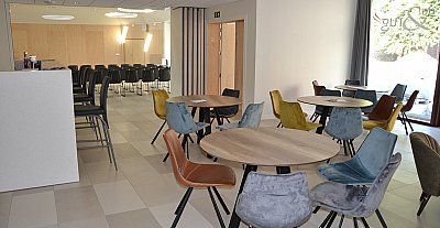 capaciteit: 20 personen aan 4 ronde tafels en 8 personen in loungezeteltjes; 40 personen in theateropstelling